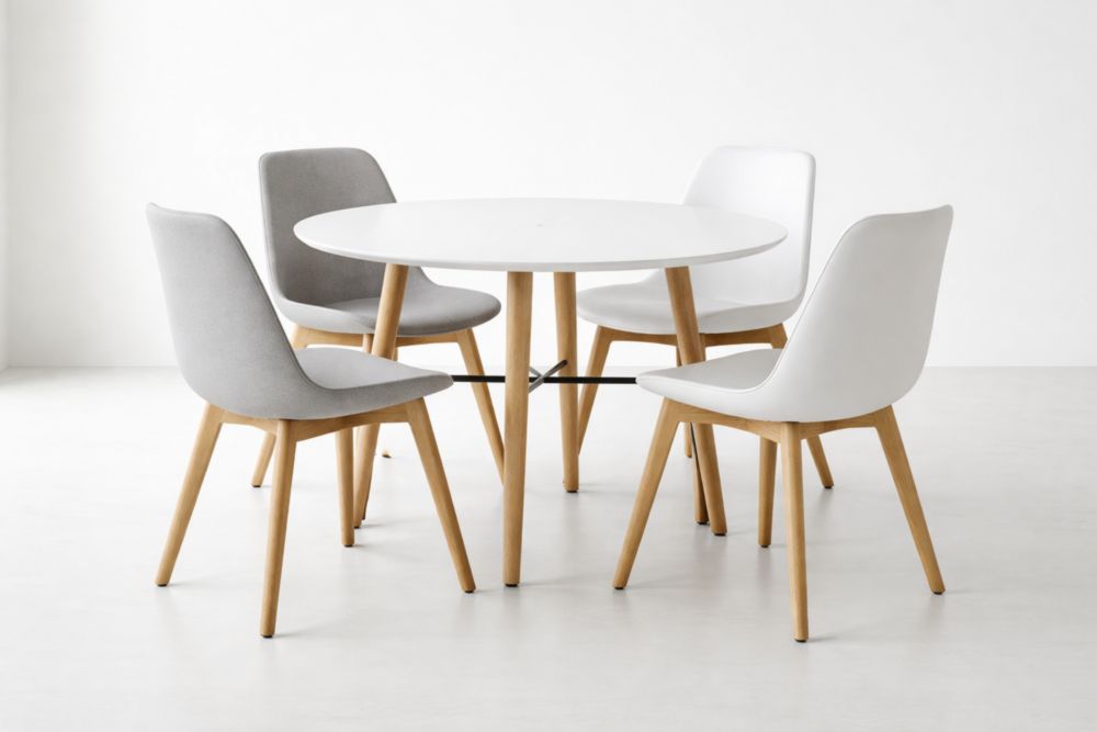 Round White Table with Four Grey and White Chairs Set Wood Legs