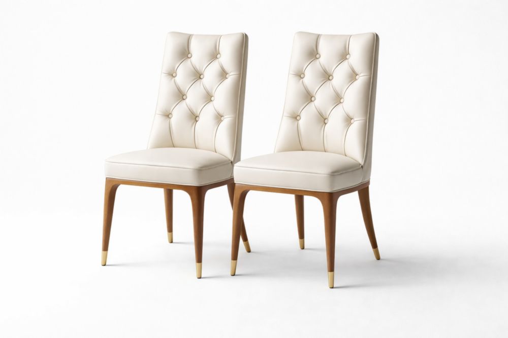 Set of 2 Cream PU Leather Dining Chairs with Wood Legs and Tufted Backrest